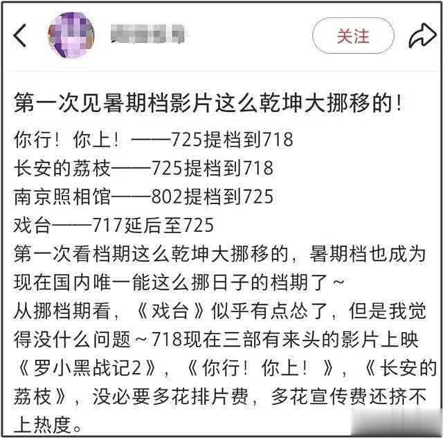 未来半个月内,跳跃十部国产新片晓谕定档,其中四部真东说念主电影诊治了档期,差别是《长安的荔枝》、《你行!你上!》、《南京影相馆》和《戏台》。前三部提档后,又有一部诊治为延期,暑假档的“战火”因此逐步升温,大片混战一触即发。