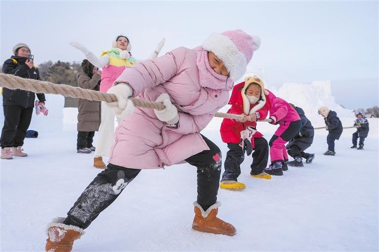 小一又友在太阳岛雪博会园区玩雪地拔河。