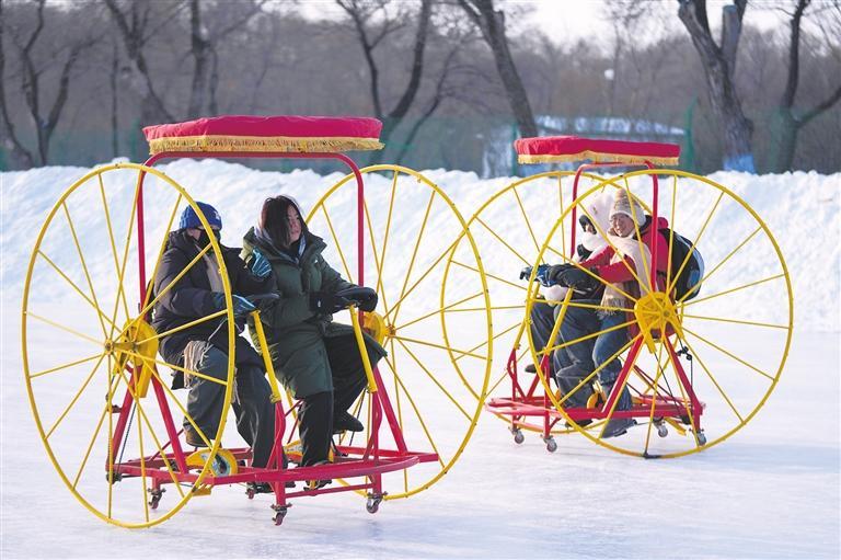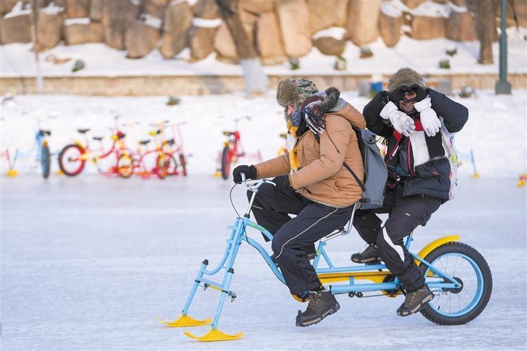 异邦旅客在太阳岛雪博会园区体验冰上自行车。