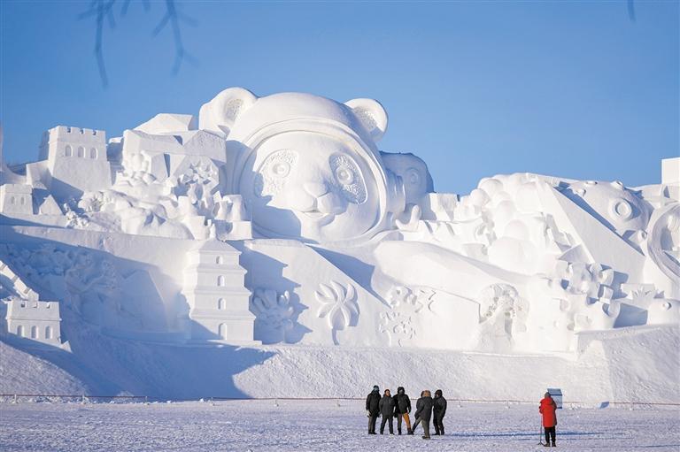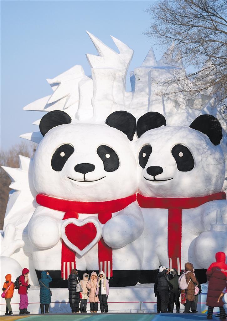 旅客在太阳岛雪博会巨型大熊猫雪雕前留影。