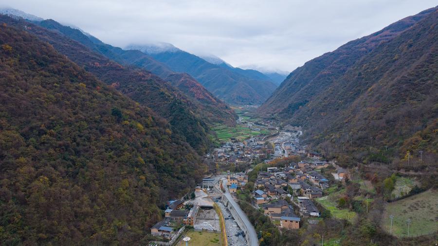 这是11月19日拍摄的甘肃省陇南市文县铁楼藏族乡草河坝村全景(无东说念主机相片)。新华社记者 郎兵兵 摄