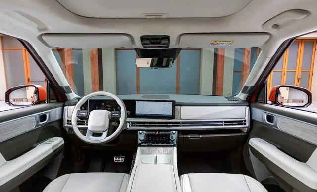 车内可触区域多为皮质包覆,空调出风口及门板饰以木纹,配不息式氛围灯,显硬朗高档。中控台配双12.3英寸曲面液晶屏及10英寸HUD,保留实体按键,增科技方便。
