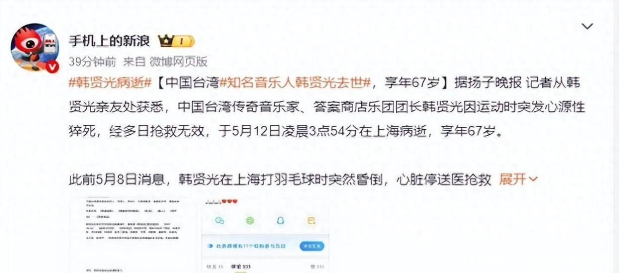 文娱圈再传死讯!5月12日凌晨3点54分,台湾著名音乐东说念主韩贤光在上海病逝,享年67岁。这位一手打造《光棍情歌》《白摇滚》等经典金曲的"音乐教父",因打羽毛球突发腹黑骤停倒地,抢救7天仍未能辅助生命,让统共这个词藻语乐坛堕入悼念。
