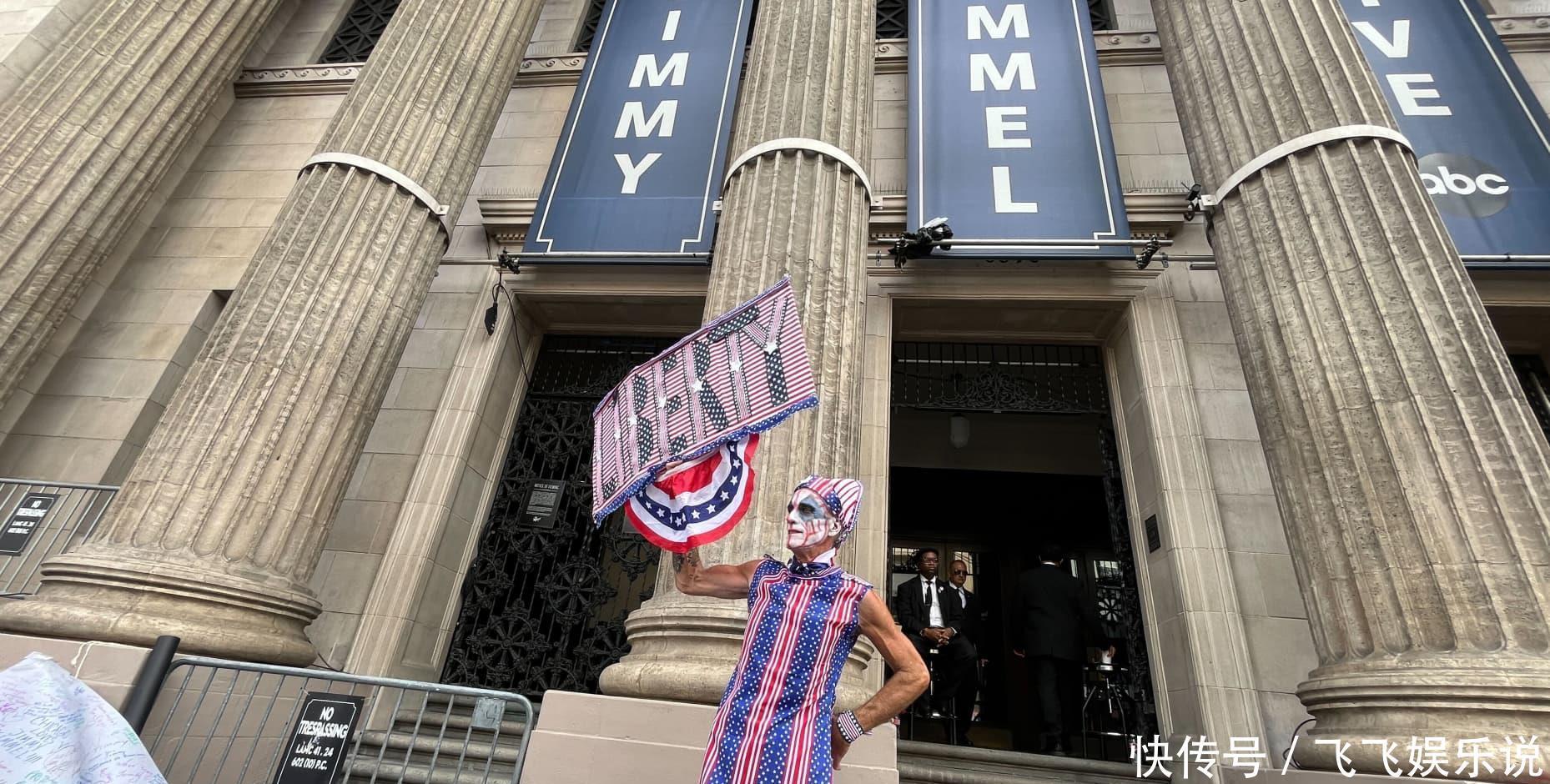 与此同期,头戴玄色高顶弁冕、身穿红色西装外衣的格雷格·多诺万 (Gregg Donovan) 举着一块层压口号,接待吉米·坎摩尔 (Jimmy Kimmel) 总结。