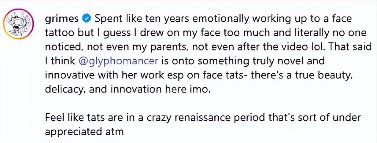 Grimes曾说过,但愿“将东谈主类的脆弱性与机械的冷峻感会通一体”。如今再看她的纹身与新专辑,这种会通已然达成。