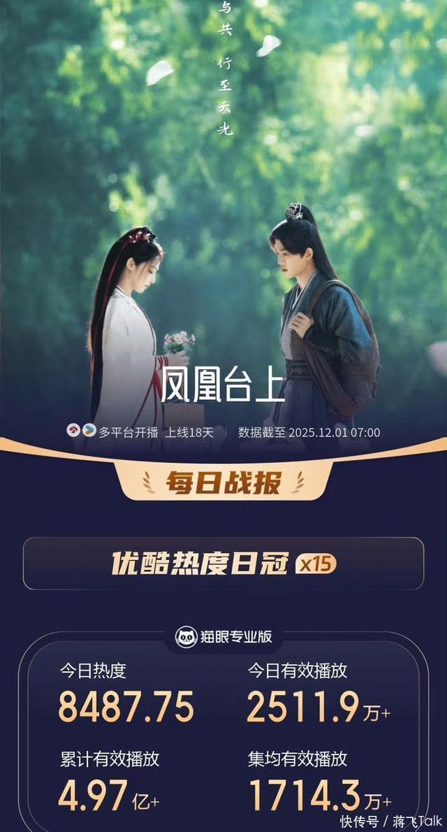 七、优酷视频《凤凰台上》 任嘉伦、彭小苒、张耀、陈意涵、汪卓成、鹤男、刘梦芮、骆明劼、高朝阳、傅方俊、赵柯、李彧主演的古装爱情别传剧。 不得不说,《凤凰台上》果真精确拿捏了古装虐恋的精髓!4集就完成“江湖相识+同气相求+见师弑师+反目失和”的高能滚动,甜是真甜,刀亦然真刀,双强互虐根底停不下来! 开播首日优酷站内就破6900+,收官峰值达9224,猫眼热度达9465.76,单日有用播放量破3793万,累计有用播放量超4亿。登顶优酷剧集热度榜、女性爱看榜、古装爱情榜TOP1。