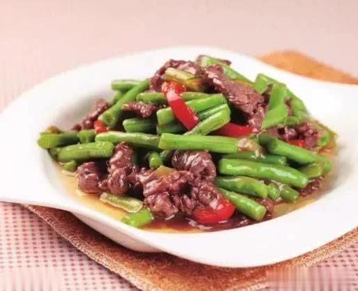 2、豆角清洗干净切小段,然后热锅烧油,油热,放入牛肉煸炒滑熟,再盛出备用。
