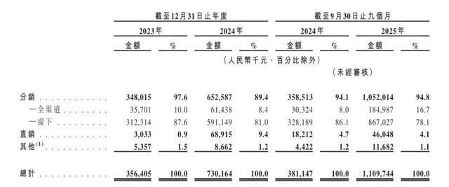 从销售渠谈看,金星啤酒现在的营收主要来自分销,直销占比恒久不足10%。招股书骄横,2023年、2024年及2025年1-9月,分销收入占比诀别为97.6%、89.4%、94.8%。